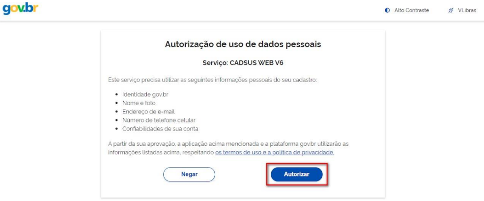 Após inserir a senha e clicar em “Entrar”, será exibida janela para autorizar o uso de dados pessoais. Clique em “Autorizar”