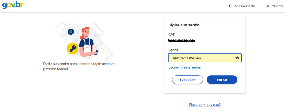 O sistema solicitará a senha. Informe a senha cadastrada anteriormente e clique no botão “Entrar”.