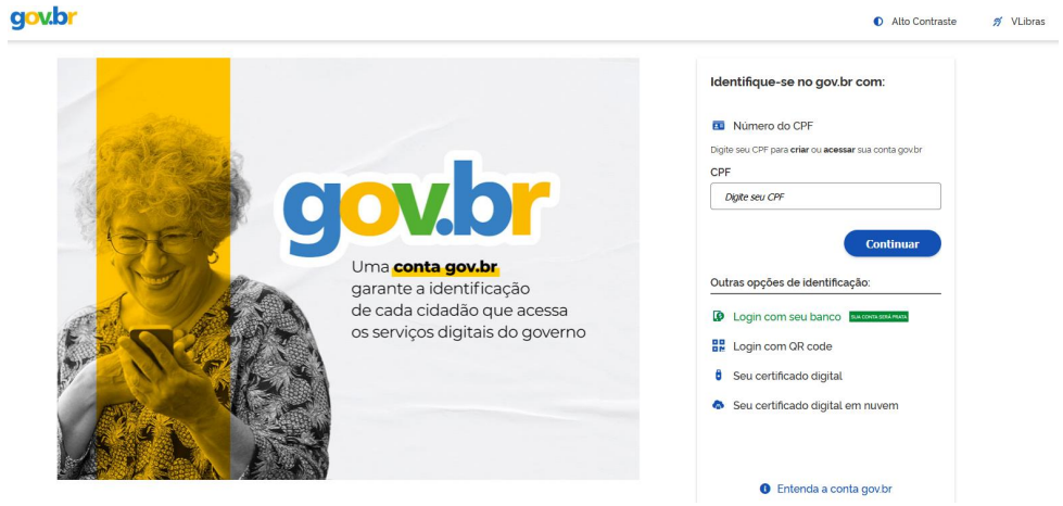 Após clicar no botão, será redirecionado para a página inicial da conta gov.br em https://sso.acesso.gov.br/, onde deverá informar o número do CPF e clicar em “Continuar”.