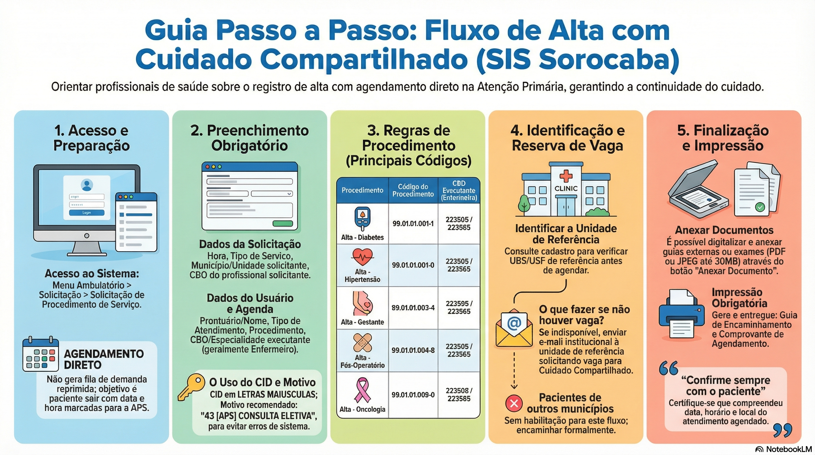 Para garantir a continuidade do cuidado, o registro da Alta com Cuidado Compartilhado deve ser realizado diretamente no sistema, no momento da alta do paciente na unidade de origem. Este registro permite o agendamento imediato da consulta na Atenção Primária, assegurando que o paciente já saia da unidade com o atendimento subsequente programado.