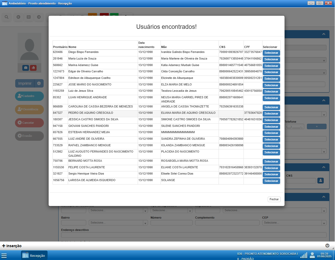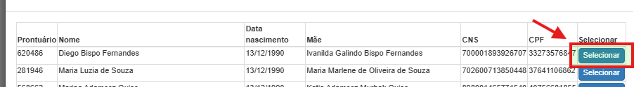 O operador deverá revisar a lista, localizar o paciente correto e clicar no botão Selecionar ao lado do registro desejado.