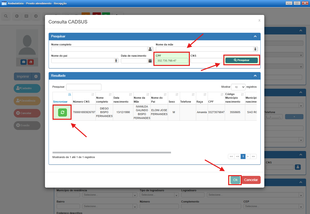 Além de realizar a busca de pacientes já cadastrados, a tela de recepção também permite a realização do cadastro direto de novos pacientes, quando não localizado na base local.