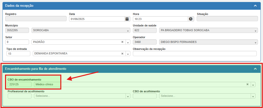 CBO de Encaminhamento: deve ser informado o código de ocupação (especialidade) para onde o paciente será direcionado na fila.