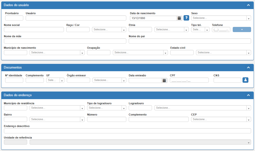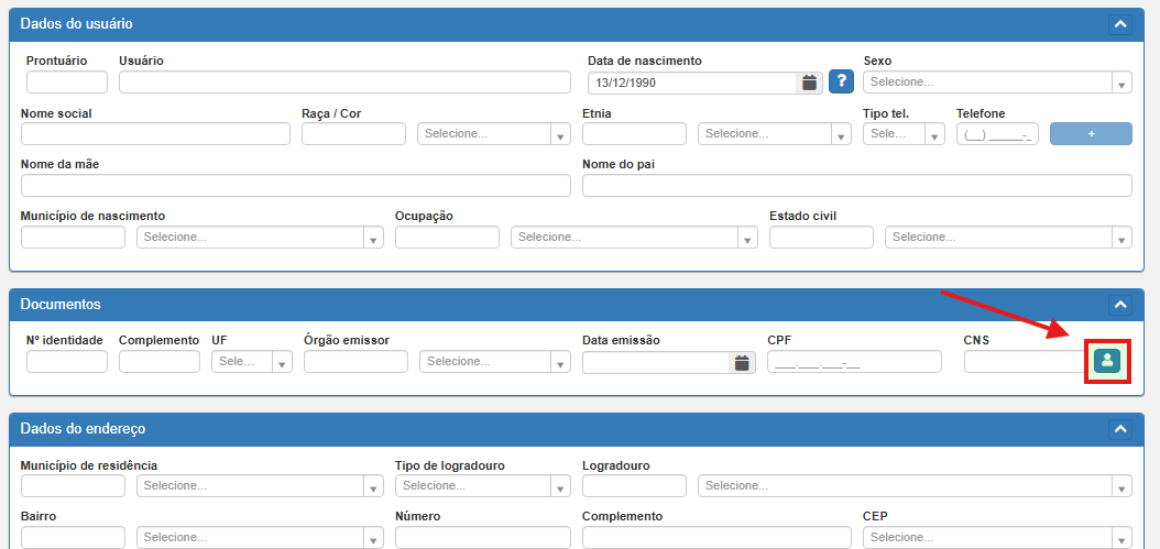 Caso o paciente não seja localizado pelos métodos de busca, preencha diretamente os campos do bloco Dados do Usuário.