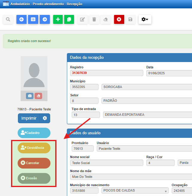 Desistência: Registra que o paciente optou por não realizar o atendimento, mesmo após ter passado pela recepção.