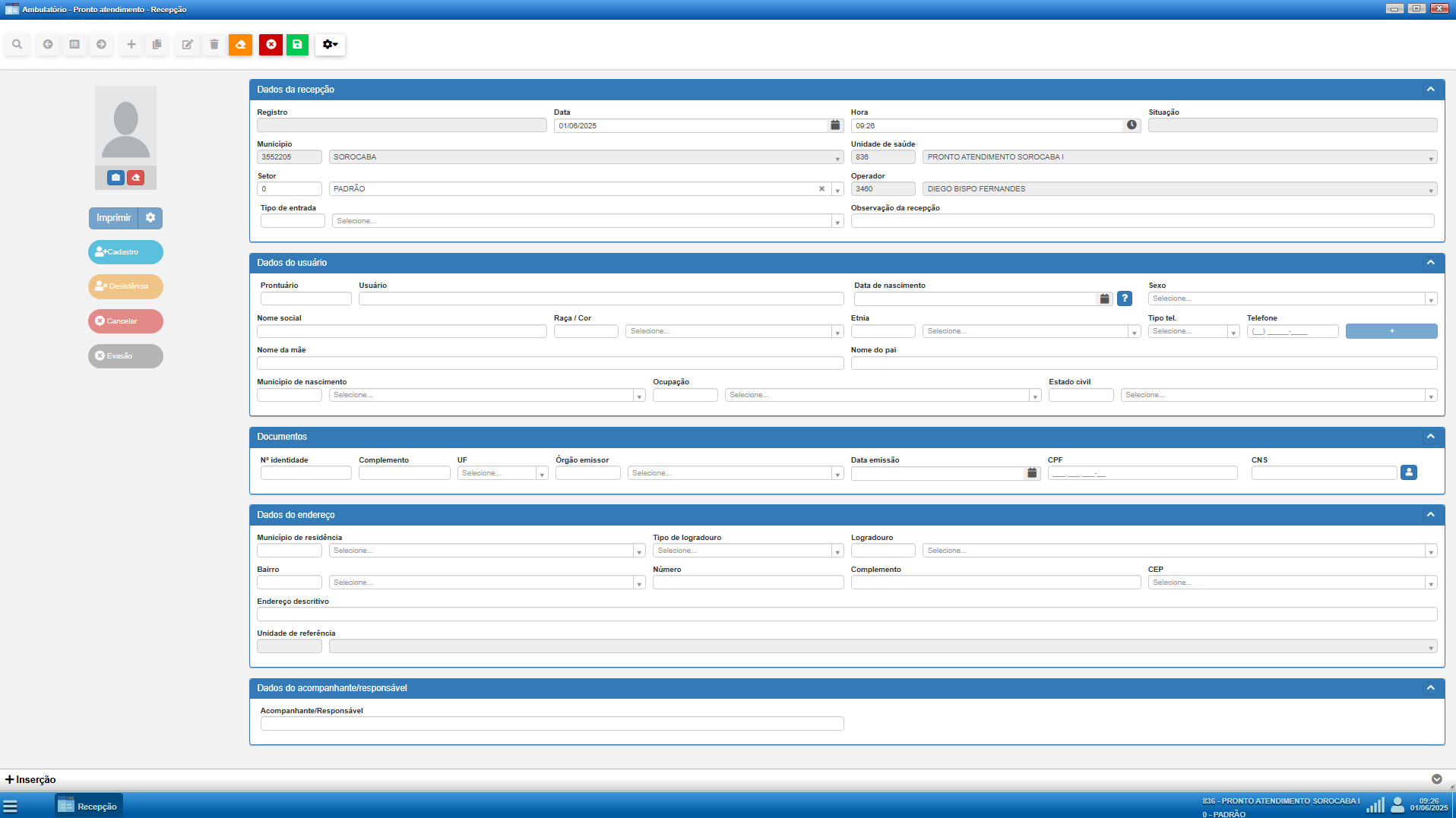 Após o preenchimento completo da recepção e o cadastro (ou identificação) do paciente, basta salvar o registro para que o paciente seja inserido no fluxo de atendimento da unidade.