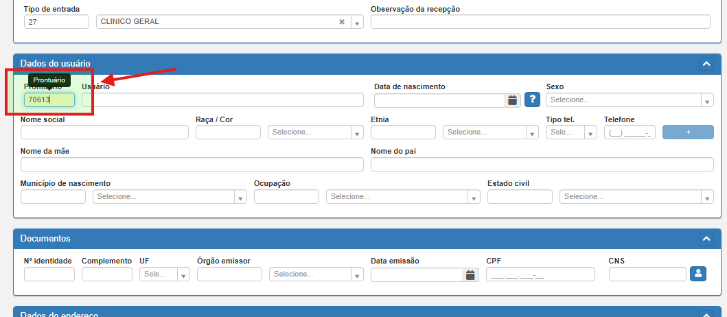 Informe o número do Prontuário no campo correspondente.