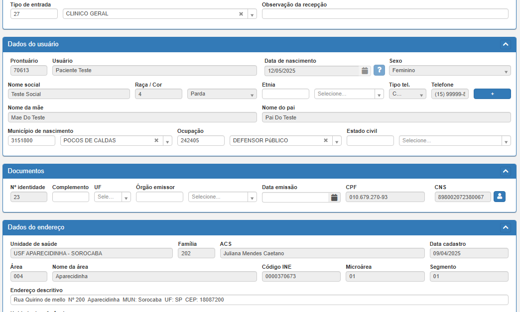 O sistema automaticamente realizará a busca na base local e carregará todos os dados já cadastrados do paciente.