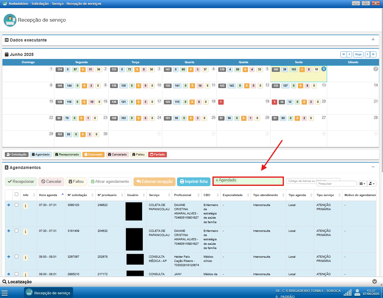 No bloco de Agendamentos, no campo Situação, recomenda-se filtrar pela situação Agendado, exibindo apenas os pacientes que ainda não foram recepcionados.