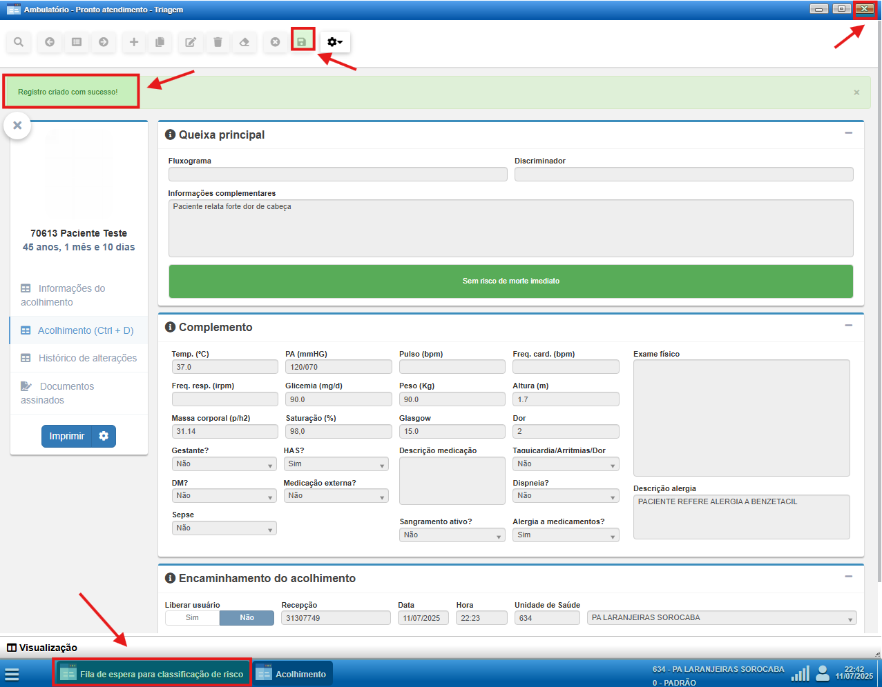 Após finalizar a triagem, é possível revisar e corrigir a classificação de risco ou o encaminhamento do paciente, caso seja necessário.