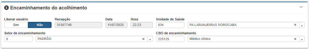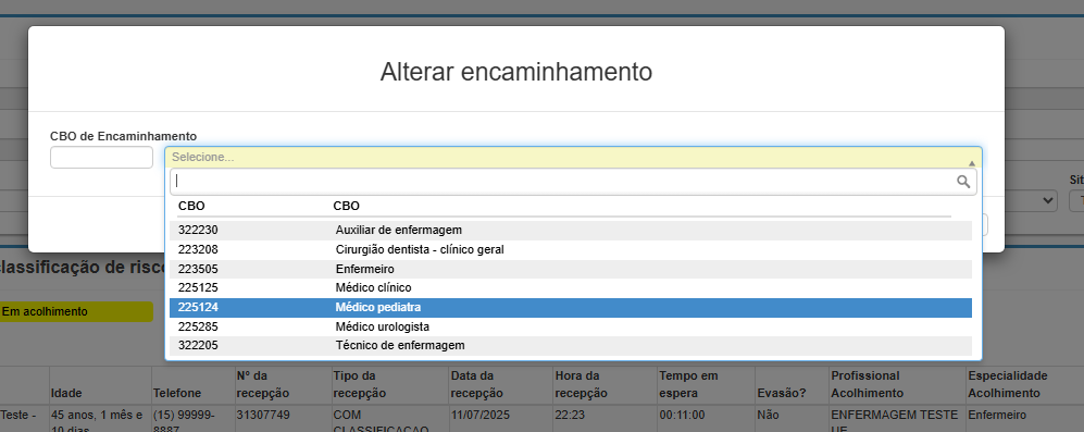 CBO de encaminhamento: aqui deve ser informado o código da ocupação para onde o paciente será encaminhado após a triagem (ex: 225125 - Médico Clínico)