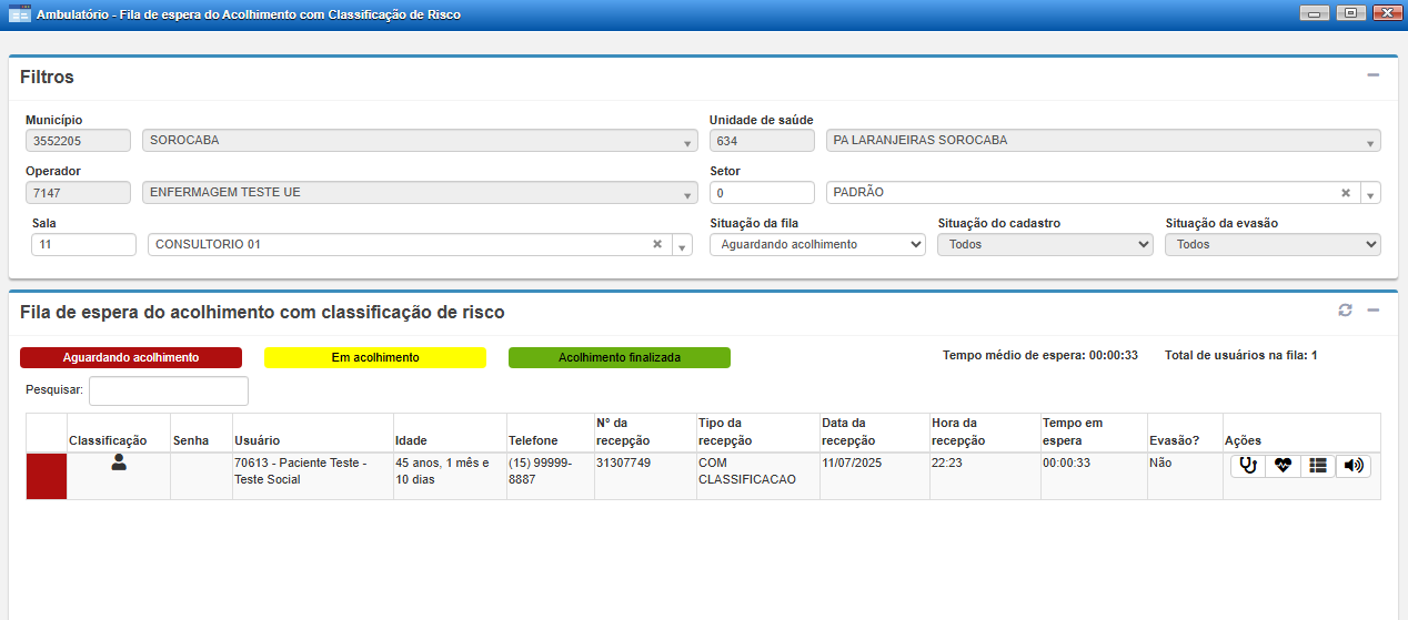 Por fim, para iniciar a triagem, clique no botão de acolher (ícone de coração) na coluna de Ações.