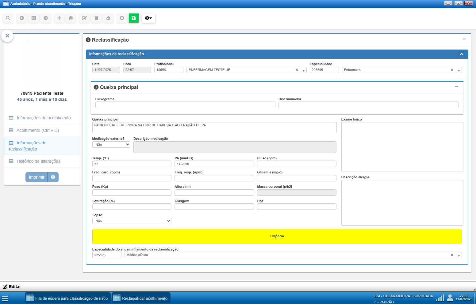 Caso a equipe identifique que a classificação de risco atribuída ao paciente precisa ser corrigida, é possível realizar a reclassificação mesmo após o encerramento da triagem.