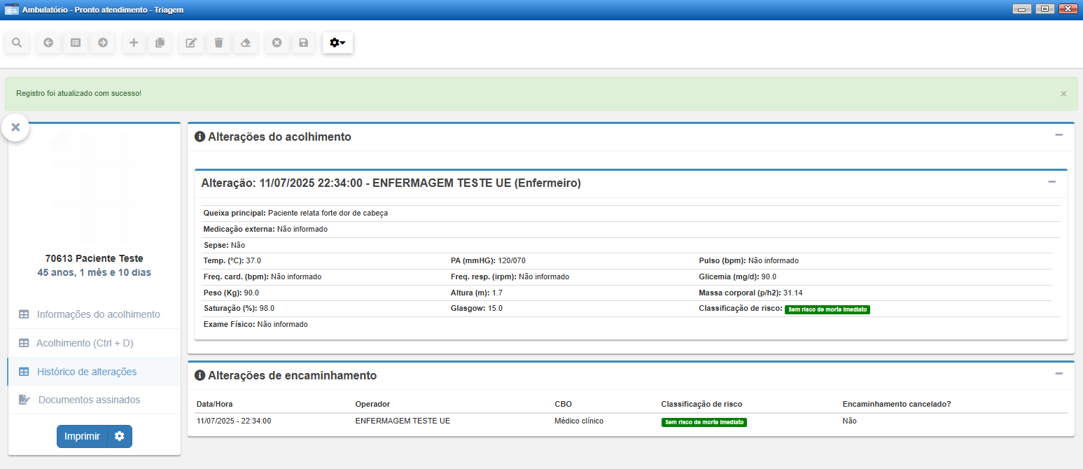 Essa funcionalidade reabre a tela de triagem, permitindo um novo registro com atualização dos dados clínicos e da cor de risco atribuída ao paciente. Toda alteração realizada fica registrada no Histórico de alterações, garantindo rastreabilidade do processo.