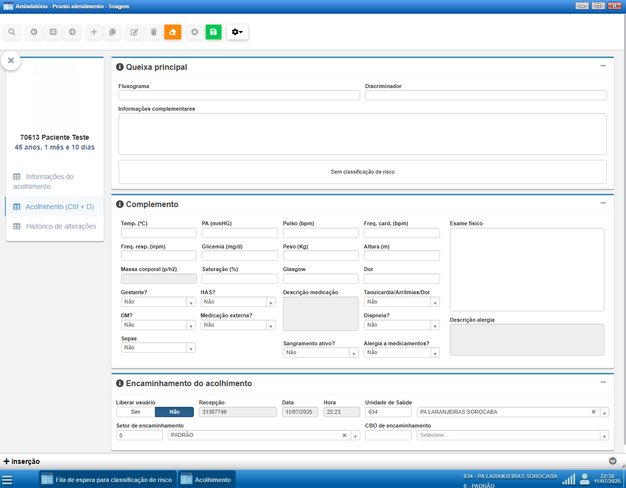 A seção Complemento da triagem reúne dados clínicos essenciais para subsidiar a tomada de decisão imediata e orientar o fluxo correto do paciente na unidade. Sempre que possível, todos os campos devem ser preenchidos, mesmo que o valor seja “zero” ou “ausente”. Esses registros não apenas auxiliam na condução do caso no momento do acolhimento, mas também: