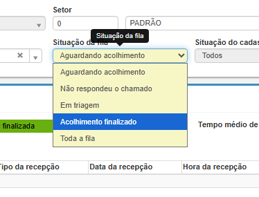 No bloco de filtros, altere o campo Situação da fila para Acolhimento finalizado.