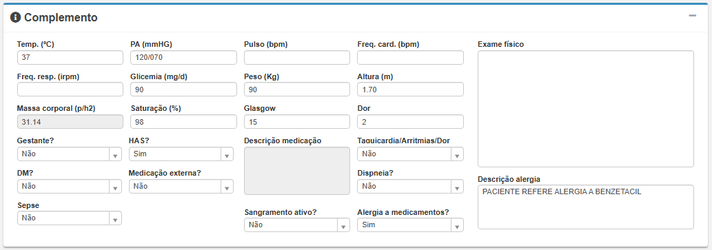 Observações relevantes no campo Exame Físico e descrição de medicações/alergias, se aplicável.