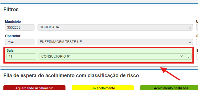 Antes de iniciar qualquer atendimento, é importante preencher o campo Sala no bloco de Filtros, informando o local onde o paciente deverá comparecer. Embora o preenchimento não seja obrigatório pelo sistema, ele é fundamental para que a chamada por meio do ícone de alto-falante direcione corretamente o paciente até o consultório ou sala de triagem, garantindo mais organização e agilidade no fluxo de atendimento.
