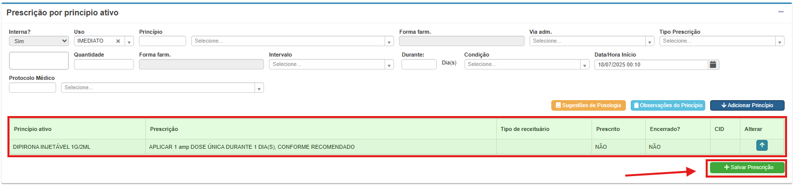 • Prescrição: área dedicada ao registro das medicações indicadas, tanto para uso interno na unidade quanto para prescrição domiciliar. Alimenta o módulo de receita e checagem.