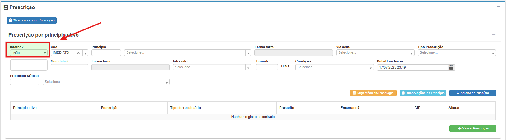 Quando a funcionalidade estiver ativa, apenas as prescrições marcadas como internas poderão ser visíveis para os profissionais responsáveis pela checagem e administração da medicação.