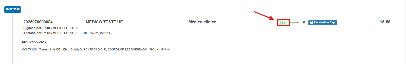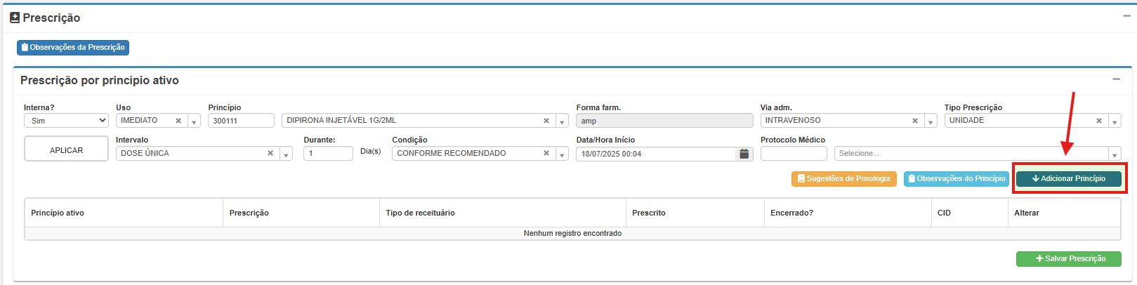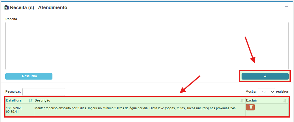 2. Clique na seta azul para baixo para adicionar a receita ao atendimento.