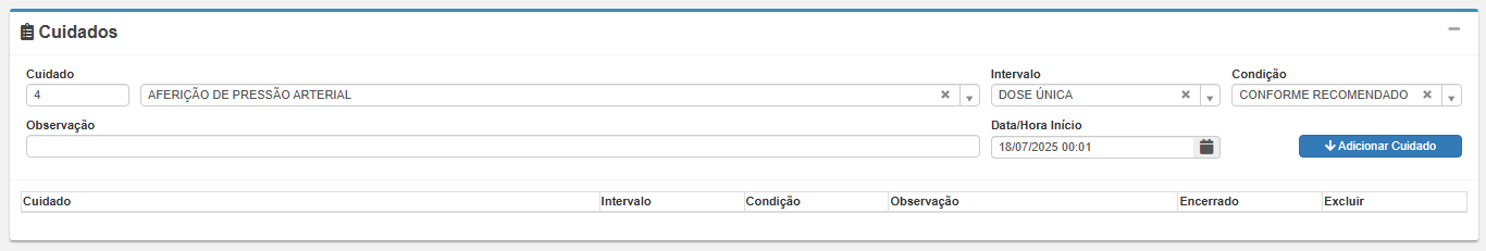 Clique em Adicionar Cuidado para incluir o registro.