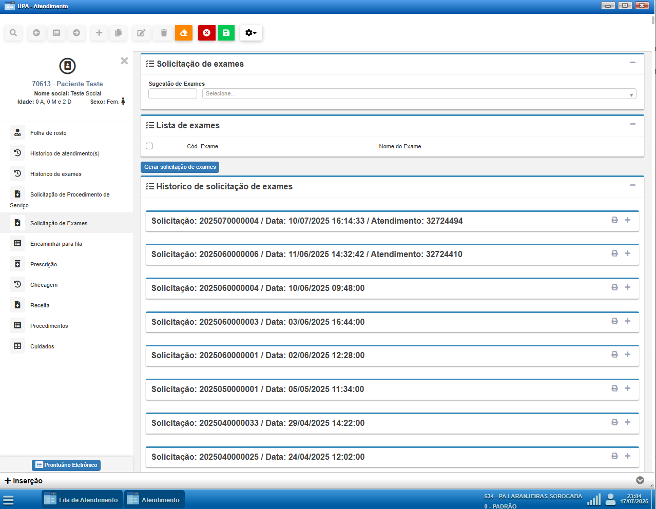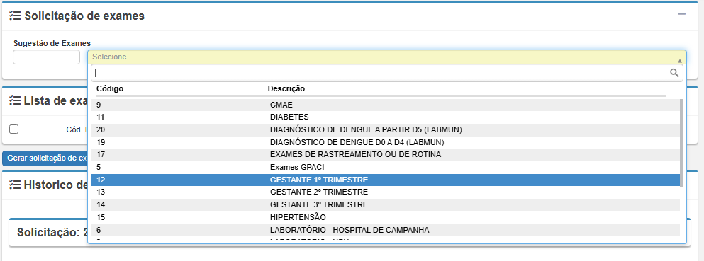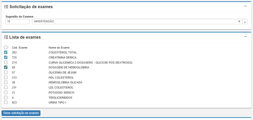 • Solicitação de Exames: módulo exclusivo para registrar pedidos de exames. Os pedidos feitos aqui podem ser automaticamente direcionados aos serviços integrados.
