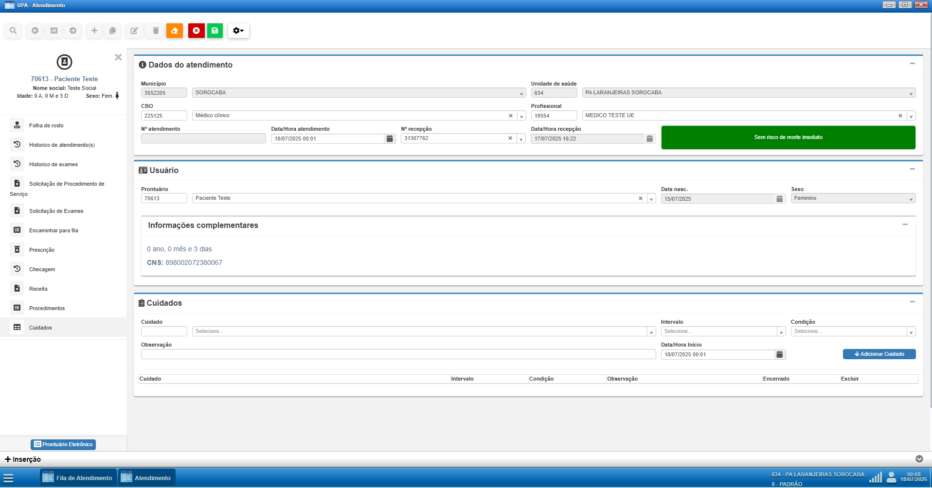 O módulo Cuidados permite o registro de procedimentos assistenciais realizados diretamente pela equipe de saúde durante o atendimento, como curativos, controle de sinais vitais, oxigenoterapia, entre outros.