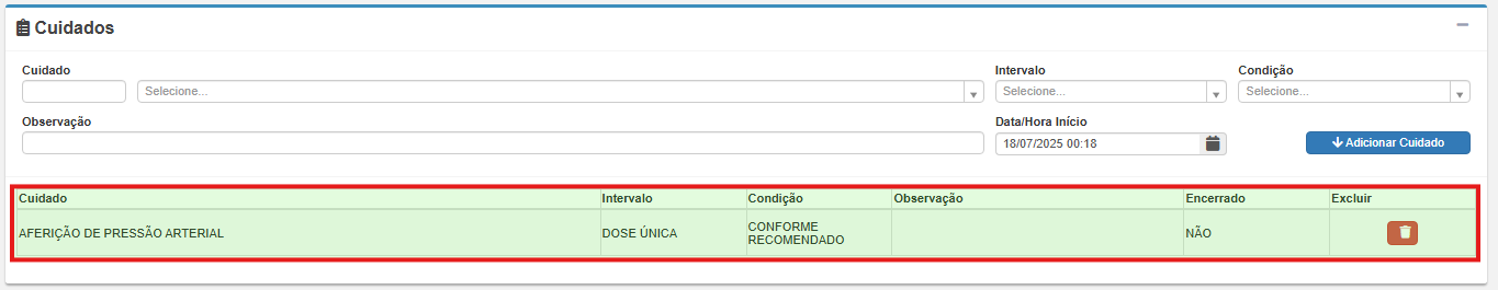 Todos os cuidados registrados são exibidos em uma grade abaixo da tela, com opção de exclusão ou encerramento (futuramente usada pela equipe na checagem).
