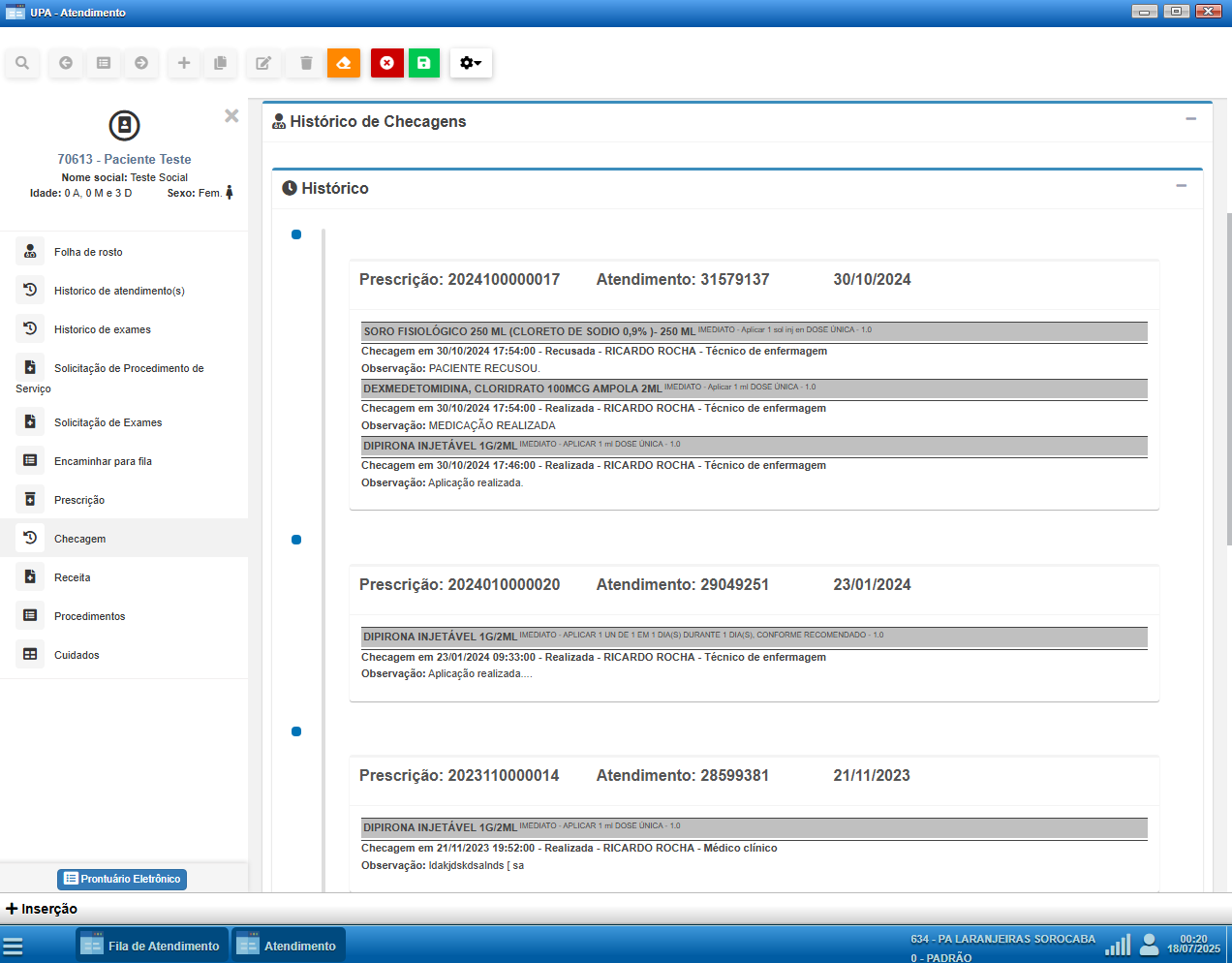 Embora o módulo de atendimento já exiba o histórico de checagens realizadas, o registro efetivo das administrações de medicamentos e cuidados pode ser feito atualmente por meio de uma tela própria chamada "Checagem", acessível fora da tela de atendimento.