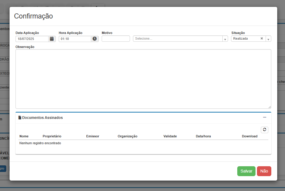 Clicando nesse botão, será aberta a janela de registro da checagem, onde o profissional deve preencher:
