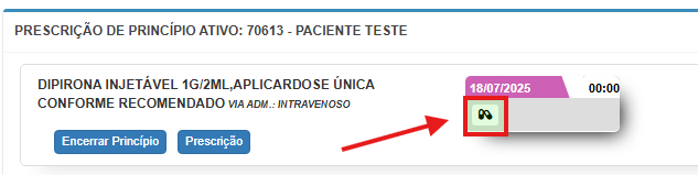 Porém, o registro na tela de checagem ocorre de maneira facilitada. Para cada prescrição listada, haverá um botão de “Confirmação” (ícone de seringa), conforme destacado abaixo: