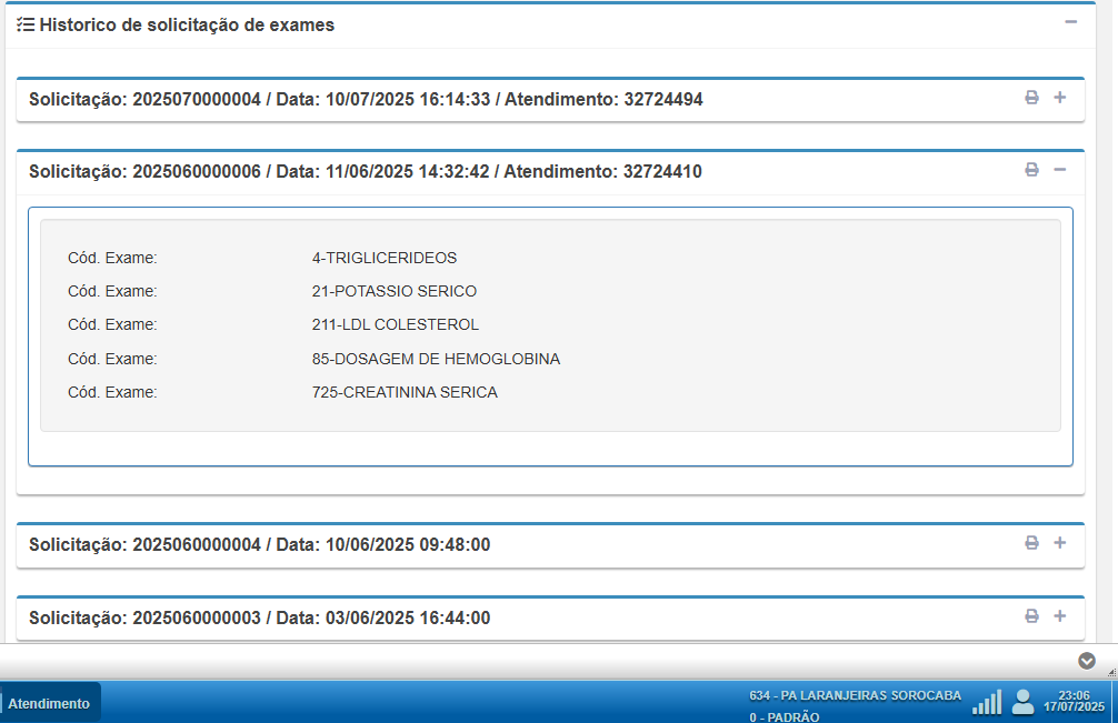 • Solicitação de Procedimento de Serviço: lista os encaminhamentos já realizados para consultas e exames especializados via demanda reprimida. Ajuda a saber quais tipos de especialidades o paciente aguarda tratamento eletivo.