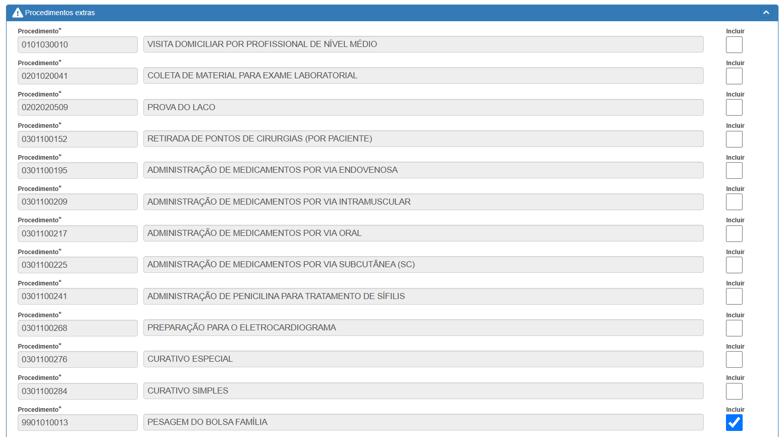 - Na escuta incial, após anotar os dados antropométricos do paciente, em "Procedimentos Extras" marcar a opção "9901010013 PESAGEM DO BOLSA FAMÍLIA";