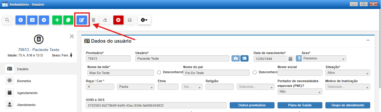 Na "barra de ferramentas" do sistema, a tela de cadastro do paciente abrirá e você deverá clicar em