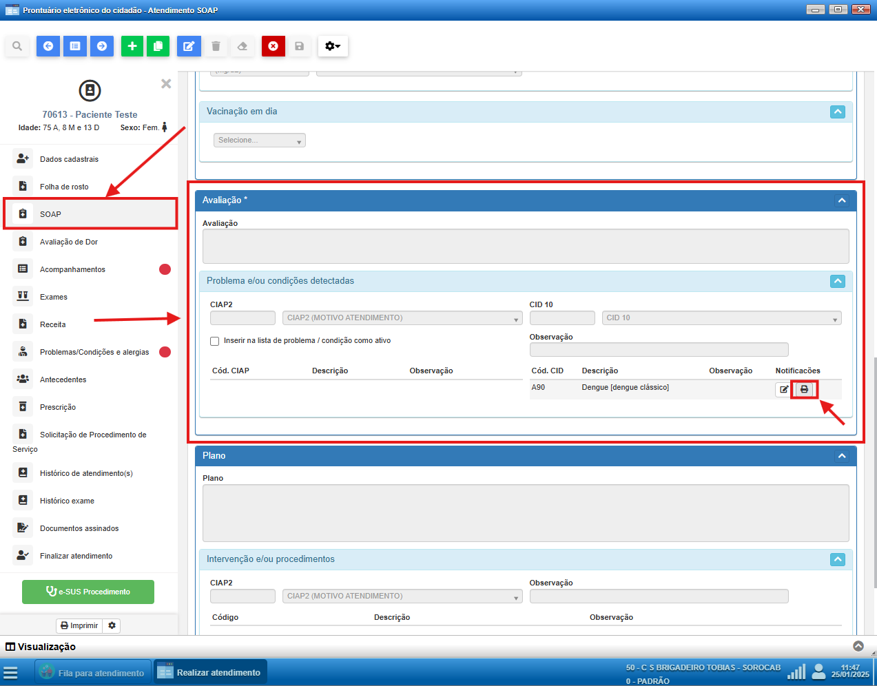 Para acessar a notificação, você deve retornar a aba SOAP, no bloco Avaliação, onde você verificará o botão de impressão da notificação.