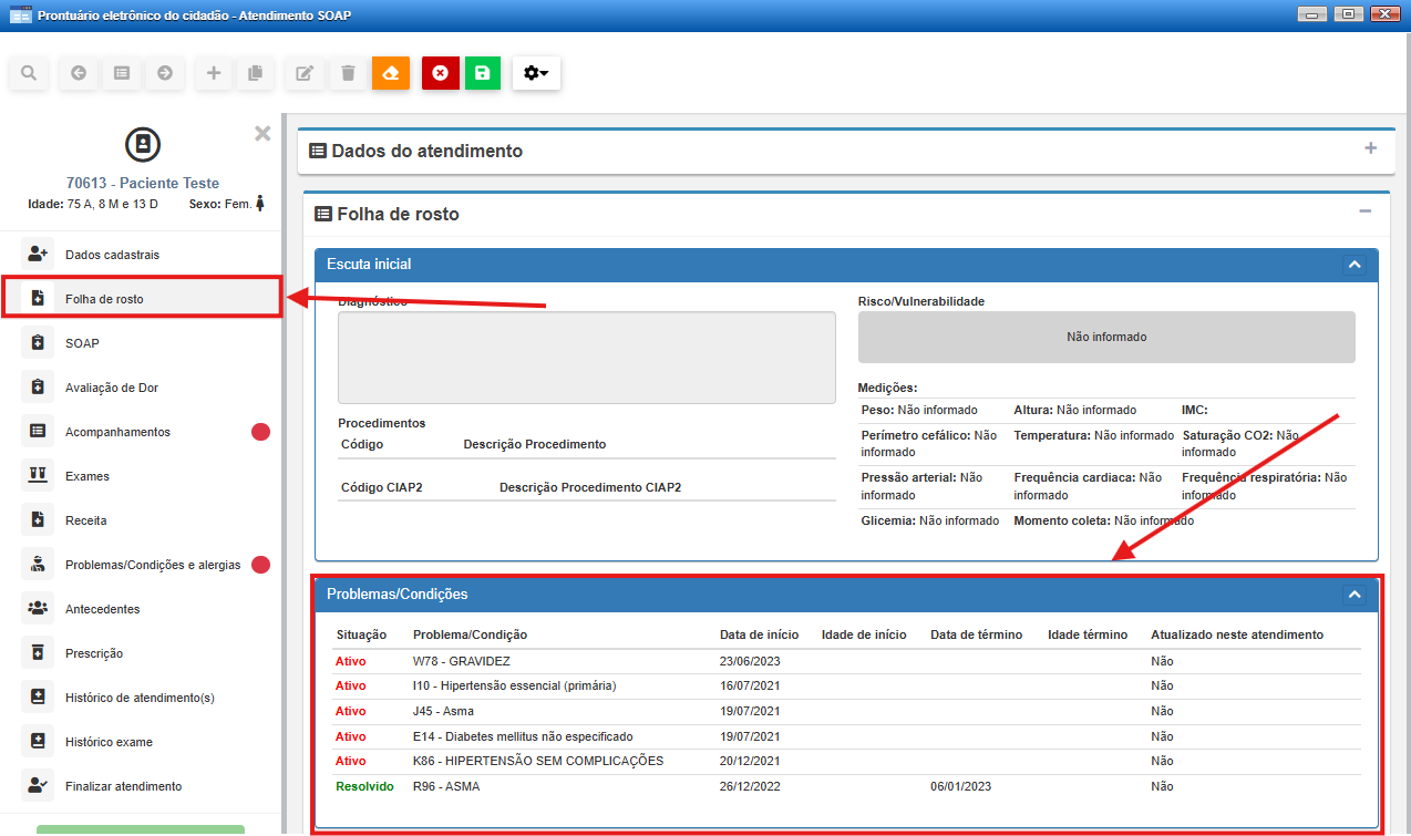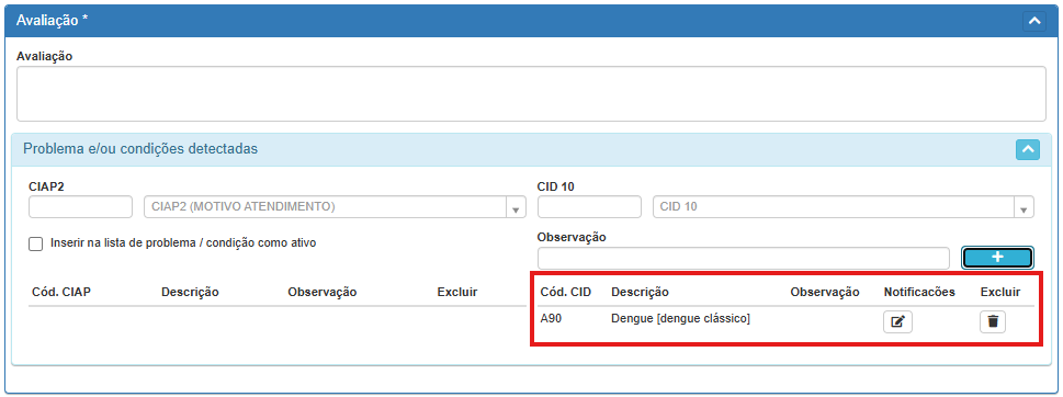 NOTA: É importante demonstrar que qualquer CID pode ser marcado como "Inserir na lista de problema/condição como ativo". Isso permitirá que qualquer profissional de nível superior, ao abrir um atendimento para o paciente atendido, visualize em tela as condições em que o paciente está em tratamento, na Folha de Rosto do Atendimento.