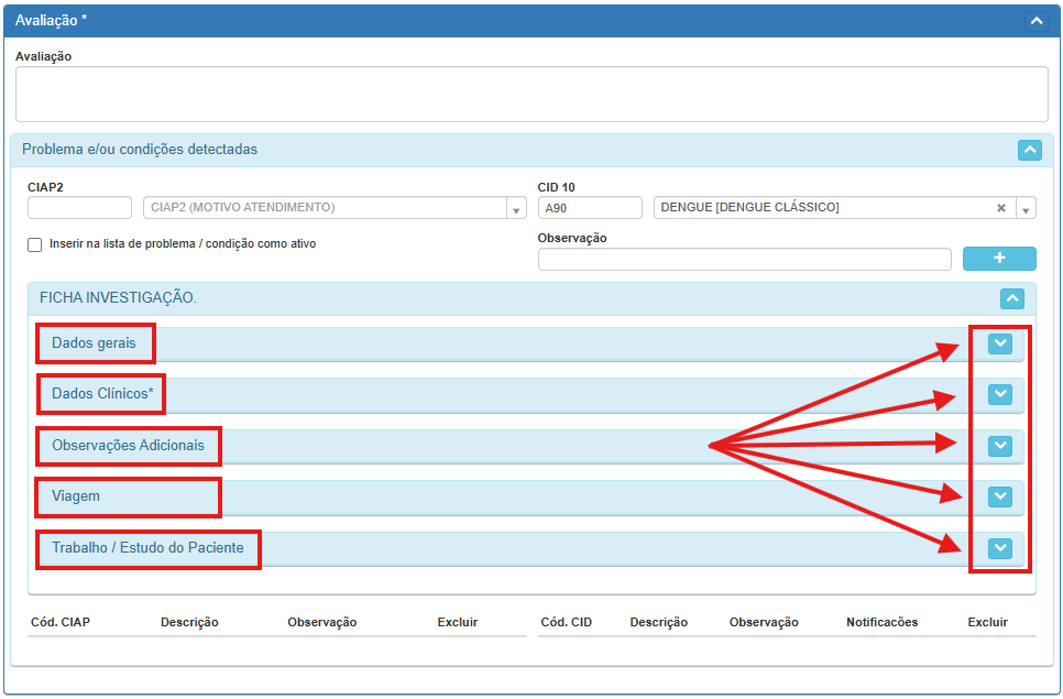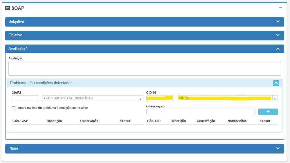 (A) Avaliação ("Hipótese Diagnóstica"): conjunto de campos que possibilita o registro da conclusão feita pelo profissional de saúde a partir dos dados coletados nos itens anteriores. Neste campo, também é possível verificar as condições de saúde latentes do indivíduo, bem como a classificação com CIAP2/ CID10.