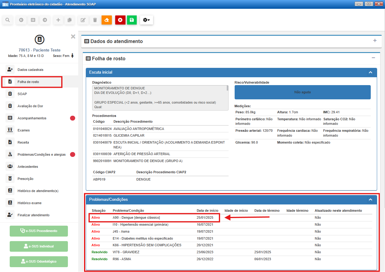 Agora sim, com a Ficha de Investigação preenchida, devemos marcar a opção "Inserir na lista de problema/condição como ativo" para facilitar a identificação futura de que esse paciente já foi acometido por dengue e clicar no botão que adicionará o CID ao atendimento (