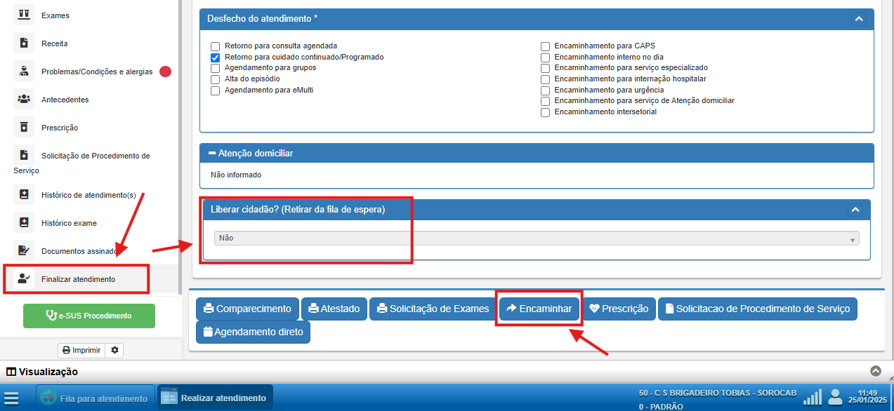 Para realizar o encaminhamento, lembre-se de que em "Finalizar atendimento" você deve preencher "Não" no bloco "Liberar cidadão? (Retirar da fila de espera)" e clicar no botão "Encaminhar", que será habilitado quando a ficha de atendimento for finalizada.