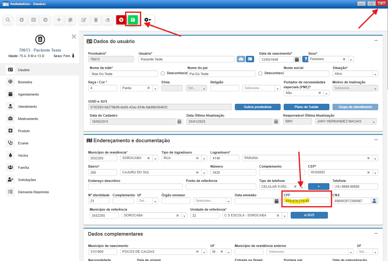 No caso do exemplo abaixo, o CPF foi informado e o cadastro foi atualizado, clicando em