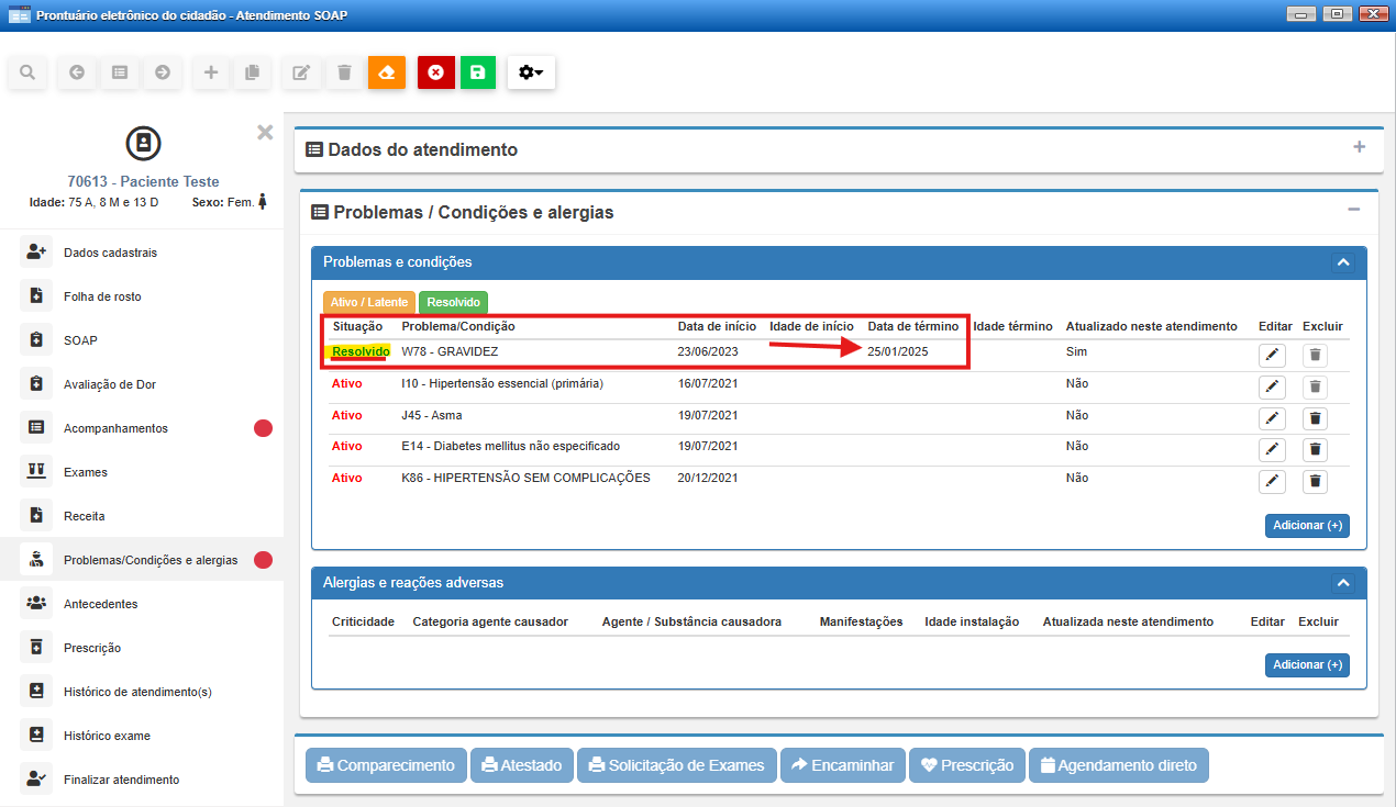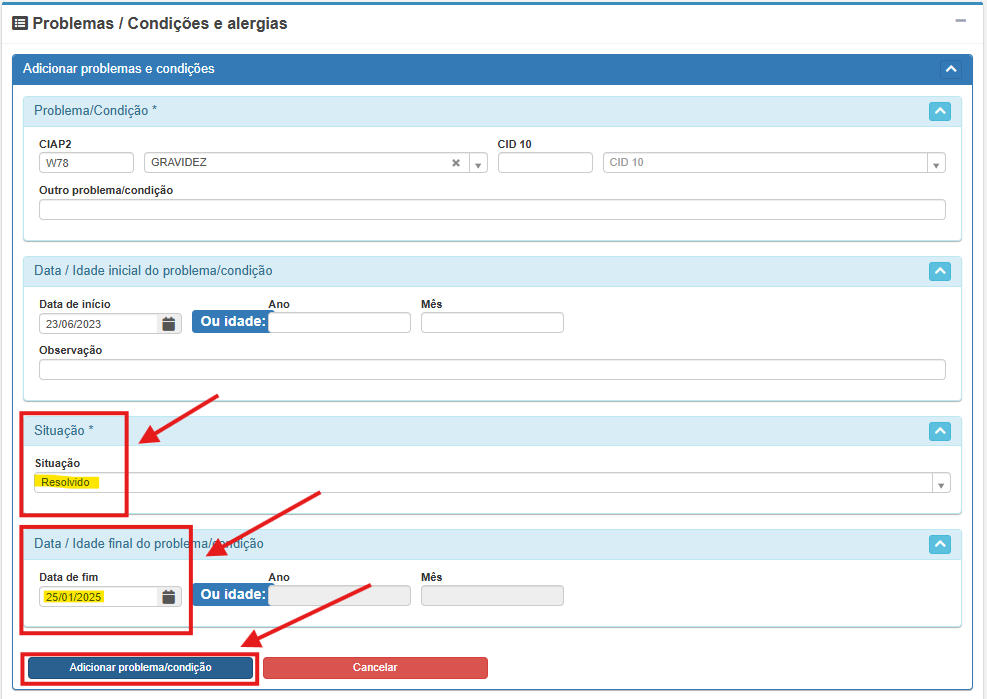 Editando e adicionando as informações de Situação e Data de fim, o problema/condição deverá ser atualizado no atendimento.