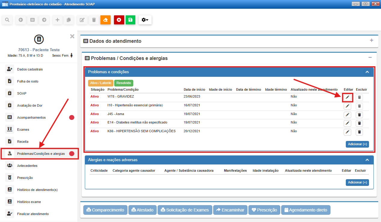 E, caso exista algum problema/condição que você identifique como já solucionado, você deve sinalizar em "Problemas/Condições e Alergias" no SOAP.