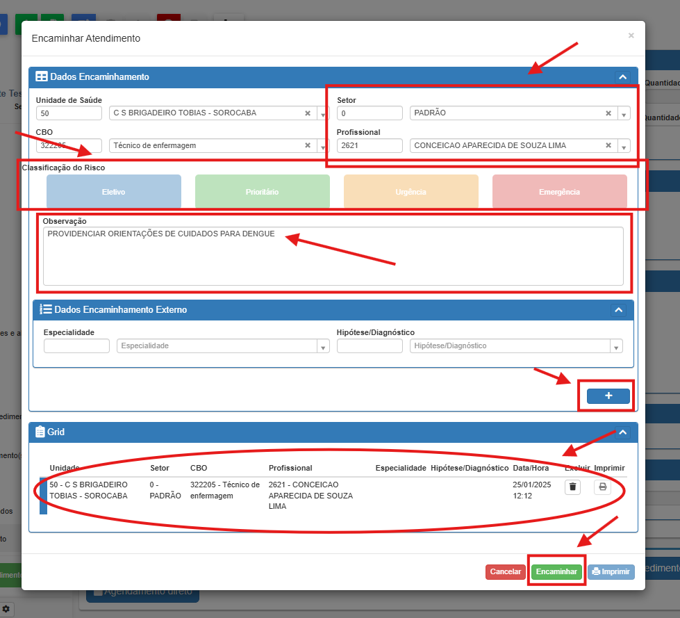 Após, selecione qual é a classificação de risco para esse encaminhamento de acordo com o que foi avaliado em consulta, preencha as observações com a prescrição e realize e clique em