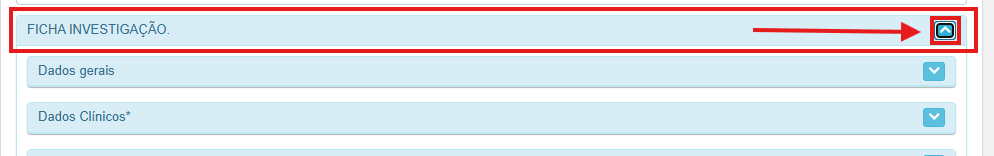 Finalizando o preenchimento correto da Ficha de Investigação, para facilitar o próximo passo, indicamos que minimize o bloco da Ficha clicando no bloco "FICHA INVESTIGAÇÃO" em