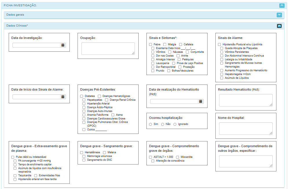 Note que a Ficha de Investigação pertence a grupos de informações que também se encontram minimizados e que devem ser expandidos um a um, clicando em