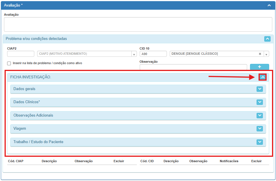 IMPORTANTE: O botão para adicionar o CID deverá ser acionado apenas após o preenchimento da Ficha de Investigação, caso contrário, o notificação não será adicionado ao atendimento.