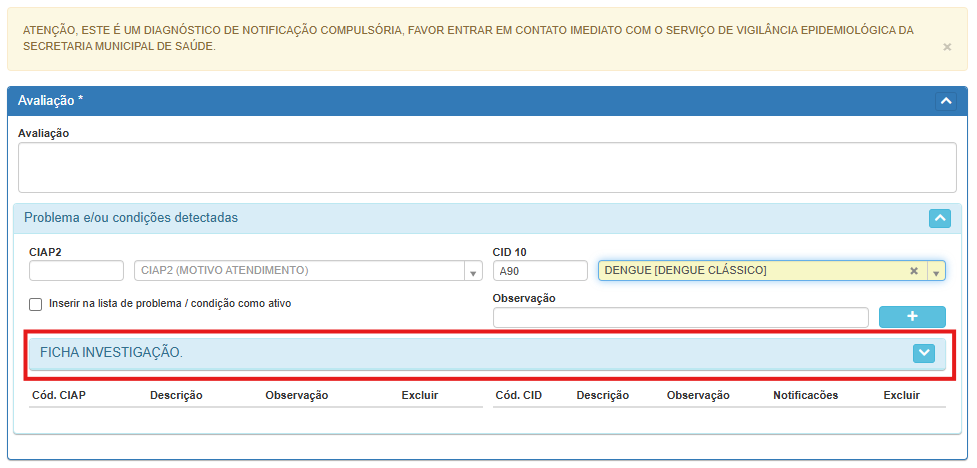 Esse alerta traz consigo a ferramenta que possibilita uma comunicação direta com a VE Municipal, através de um módulo específico do sistema, habilitando a Ficha de Investigação abaixo do botão utilizado para adicionar o CID ao atendimento (