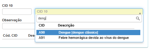 A informação do CID pode ser adicionada através do código, sem pontuações e espaços, por exemplo: A90, ou através da descrição da patologia, no campo à frente, sem precisar digitar o texto completo. Por exemplo, escrever "Deng" fará com que o sistema sugira CIDs que contenham no nome o texto digitado.