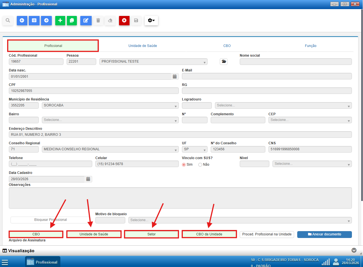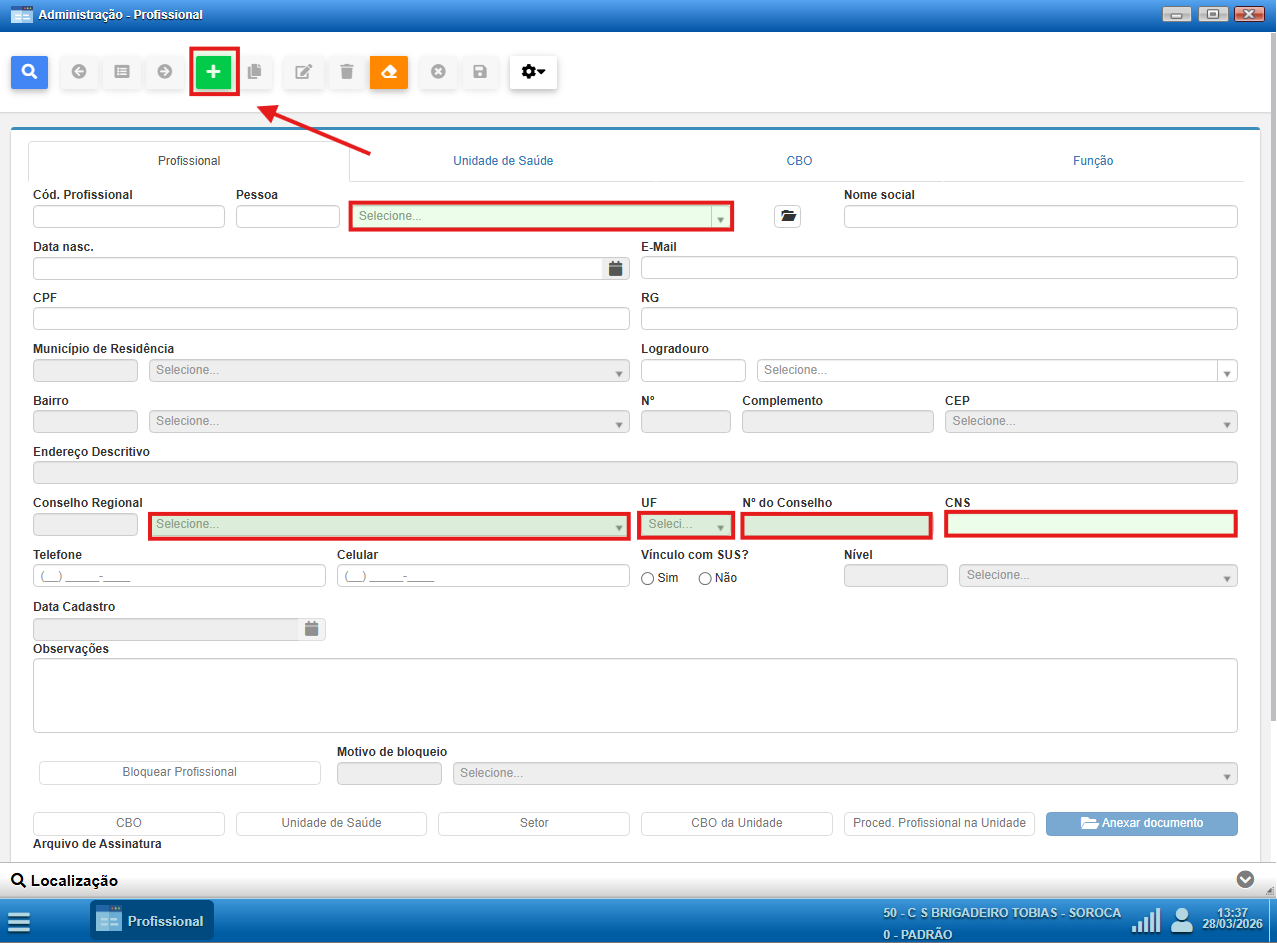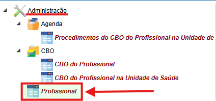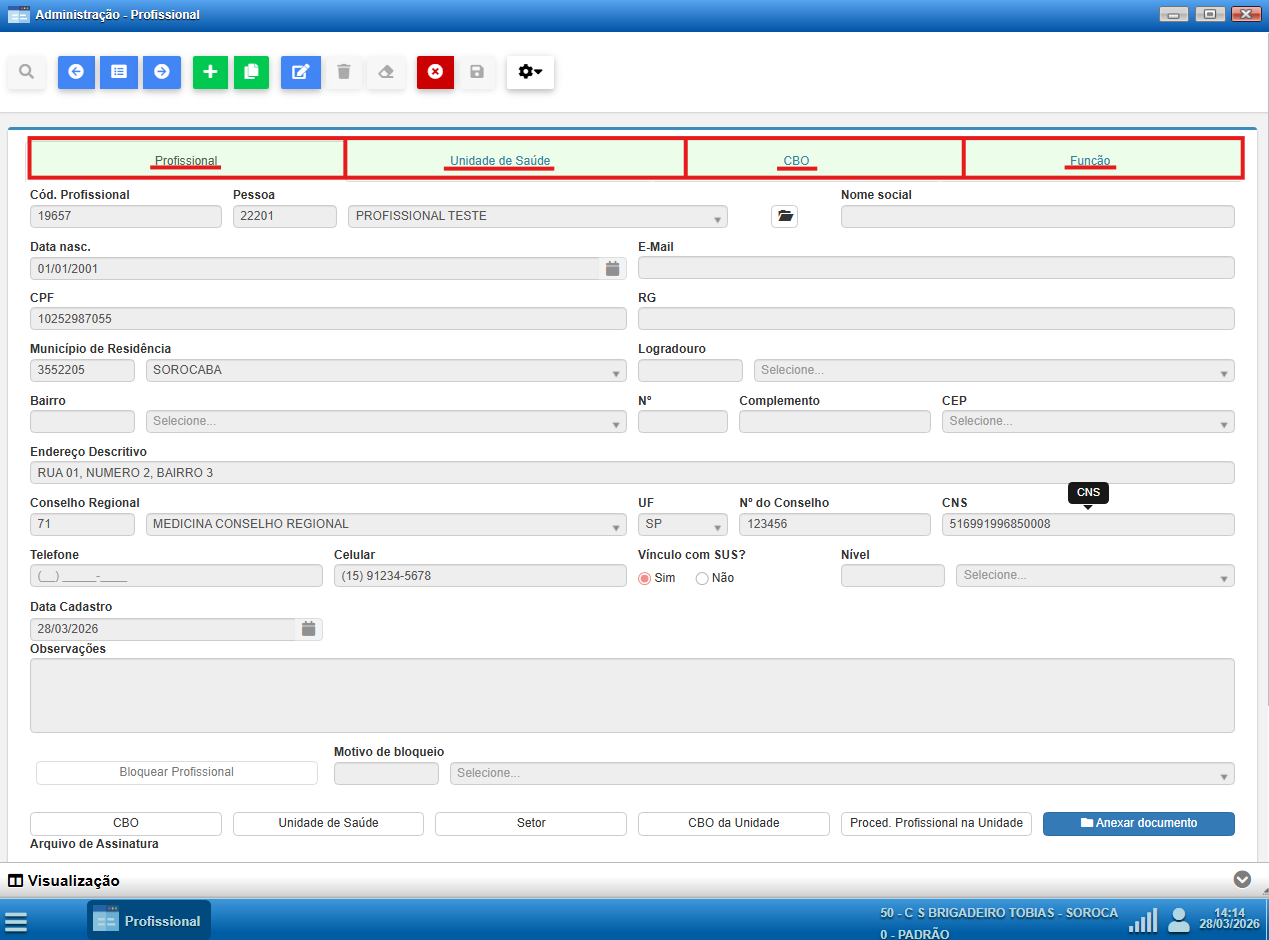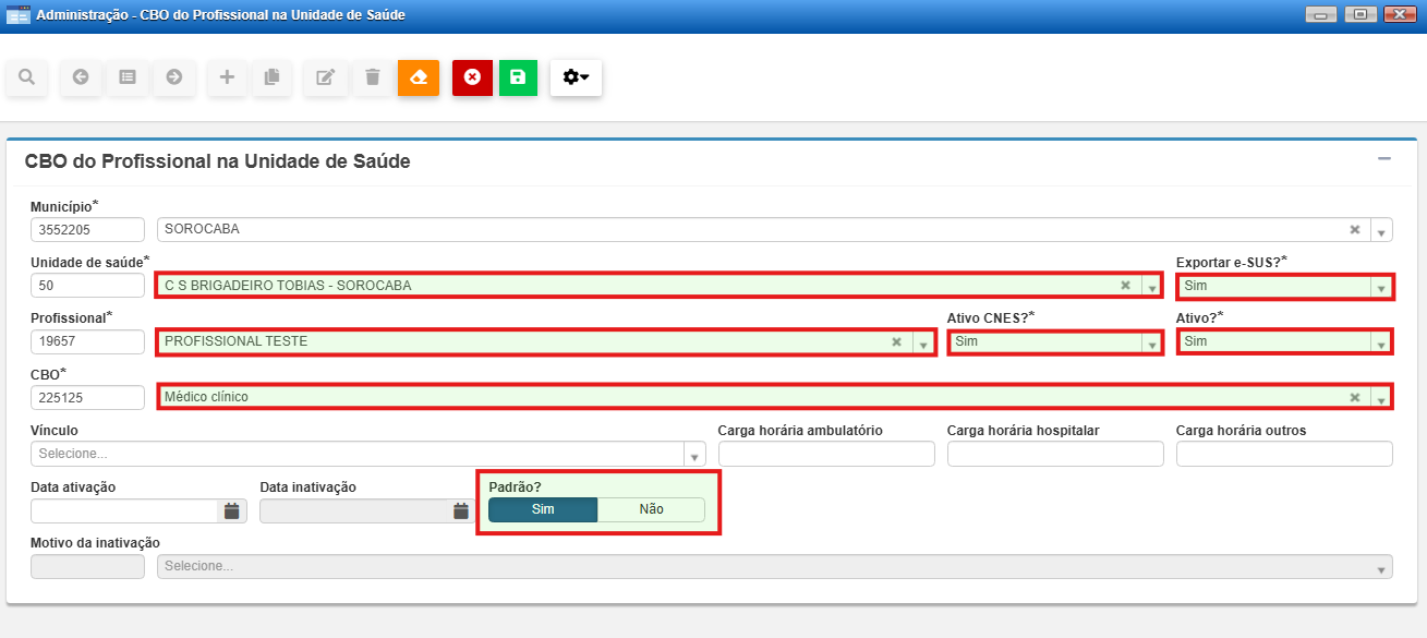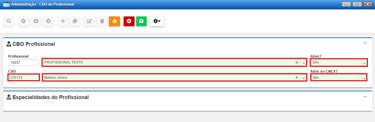 - Será aberta a tela de cadastro de CBO do profissional